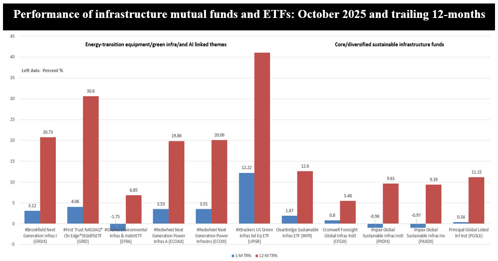 • Against this backdrop, recent performance results have been bifurcated and defined by how the nine funds aligned with the key performance drivers. The top 12-month performers are funds with the highest exposure to energy-transition equipment, green infrastructure and AI-linked power themes. These include the Brookfield Next Generation Infrastructure Fund, First Trust NASDAQ Clean Edge Smart Grid Infrastructure ETF, Redwheel Next Generation Power Infrastructure Fund (ECOAX and ECOIX) (formerly Ecofin Global), Xtrackers US Green Infrastructure Select ETF (UPGR), and to a lesser degree, iShares Environmental Infrastructure and Industrial ETF (EFRA), that on a combined basis posted average returns of 4.1% in October and 23.4% over the trailing 12 months. The funds with the highest exposure to core/diversified sustainable infrastructure (towers, toll roads, diversified utilities, water), including ClearBridge Sustainable Infrastructure ETF (INFR), Cromwell Foresight Global Infrastructure (GFGIX), Impax Global Sustainable Infrastructure Fund (PXDIX and PAXDX) and Principal Global Listed Infrastructure (PGSLX) posted respectable but lower returns, with some short-term drag from earlier rate fears and, for sustainable funds, from exclusions of traditional energy.