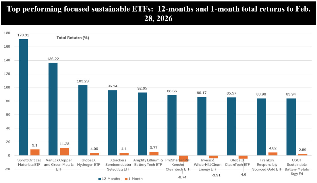 • Spanning the intersection of the global energy transition, critical minerals supply chains and next generation technology infrastructure, the top 10 performing thematic sustainable ETFs, based on their trailing 12-month results through the end of February, delivered extraordinary returns. Averaging a gain of 102.8%, the same funds recorded returns that ranged from 84% to 171%. February 2026, however, revealed a sharp split between winners and losers. Averaging 2.45% in February, results registered by the same ten funds ranged from a low of -8.74% to a high of 11.28%. Three funds recorded negative returns.