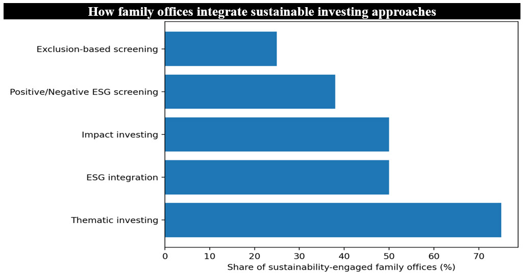 4. Thematic investing as a core expression. Thematic investing, such as climate solutions, renewable energy, healthcare innovation, education, or water infrastructure, is the most widely used sustainability approach among family offices. It fits naturally with their preference for private markets, co-investments, and long holding periods. Thematic exposure allows families to align capital with long-term secular trends without fully re-engineering public-market allocations.