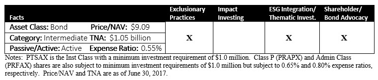 Effective January 6, 2017 the PIMCO Total Return Fund, which is an intermediate-term diversified investment grade portfolio of fixed income instruments, including non U.S. dollar denominated securities, changed its name to the PIMCO Total Return ESG Fund and at the same time modified its investment strategy to take into account the efficacy of an issuer’s environmental, social and governance (ESG) practices, to exclude securities issued by certain issuers (exclusionary strategies) from the portfolio and to engage proactively with issuers to encourage them to improve their ESG practices. The fund’s one, five and 10-year performance results have been above benchmark. But its ESG strategy is newly adopted and without the benefit of a track record. The outcome will take some time to become evident so it’s not as yet possible to evaluate the firm’s strategy implementation. That said, factors that contribute to the High Conviction assessment are PIMCO’s formidable fixed income franchise, the explicit nature of the newly adopted ESG strategy and the fact that the firm is dedicating resources to the ESG initiative which, when combined with the fund’s $1.0+ billion in net assets (assuming no defections), should give the team a strong headwind to implement the strategy. So far, the fund’s year-to-date performance exceeds that of its Bloomberg-Barclays U.S. Aggregate Bond Index benchmark. But as in the past, the fund’s future results have to overcome higher than median expense ratios, the lowest of which is 0.55% applicable to the Inst Class shares and higher for the Class P and Admin Class shares. The fund is not directly open to retail investors given that the three share classes are each subject to $1.0 million initial investments.