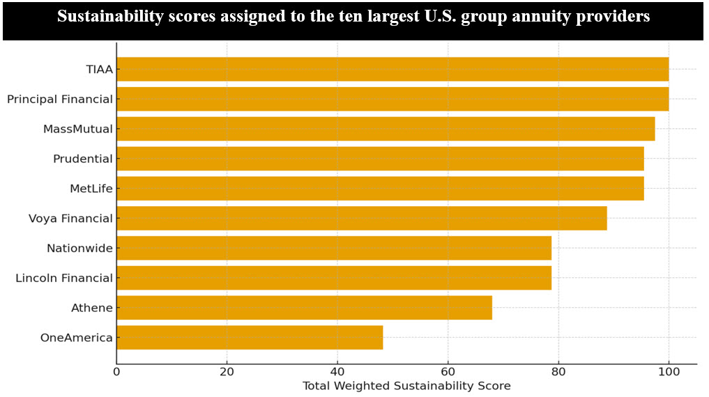 • When this framework and methodology is applied to the ten largest U.S. group annuity providers, TIAA Principal Financial, MassMutual, Prudential, MetLife and Voya Financial form the leading cluster across most criteria. These firms tend to combine: (a) Formal board-level oversight of sustainability and climate risk, often through designated board committees or explicit governance mandates, together with executive accountability for ESG integration, (b) Mature disclosure practices, including sustainability or corporate responsibility reports aligned with Task Force on Climate-related Financial Disclosures (TCFD), the International Sustainability Standard Board (ISSB), or equivalent frameworks, and a growing focus on portfolio-level climate metrics, and (c) Well-developed DC and retirement platforms, where group annuity products are deliberately integrated into plan design, default strategies, and participant-income solutions (e.g., target-date funds, managed accounts, or guaranteed-income tiers).